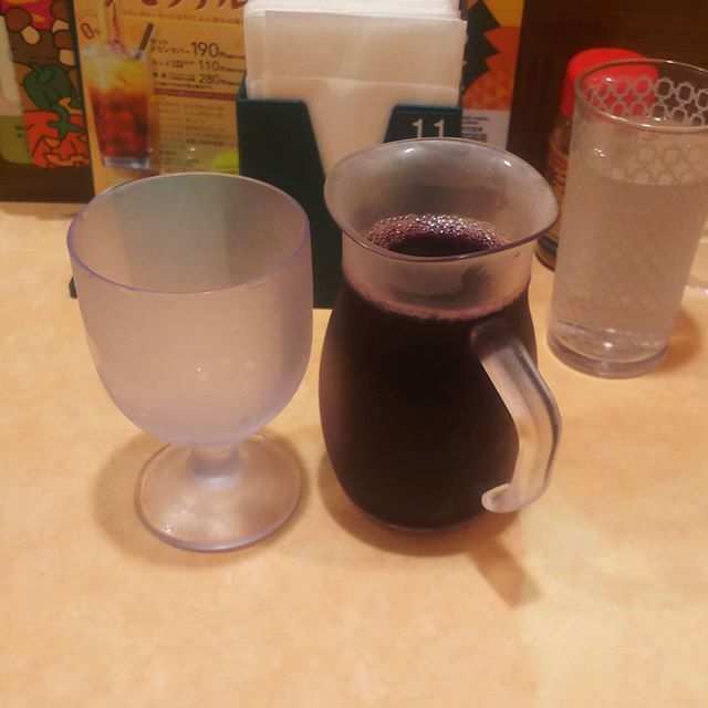 サイゼリヤでは、ボトルは何種類かあるそうですが、普通 ( ? ) のワインはグラスが 100円、250mlのデカンタとかいうのが 200円で、赤ワインと白ワインがあるのですが、基本は赤ワインをいただきます。なんだか赤ワインの方がワインって感じがするんですよね。