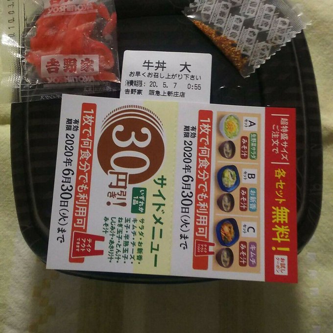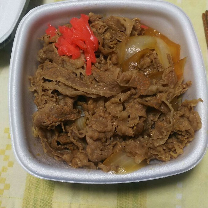今日は吉野家。夜遅いのに大盛りなんて買ってしまうオイラ。ちなみに、オイラは紅ショウガも七味も要らない人なのですが…。