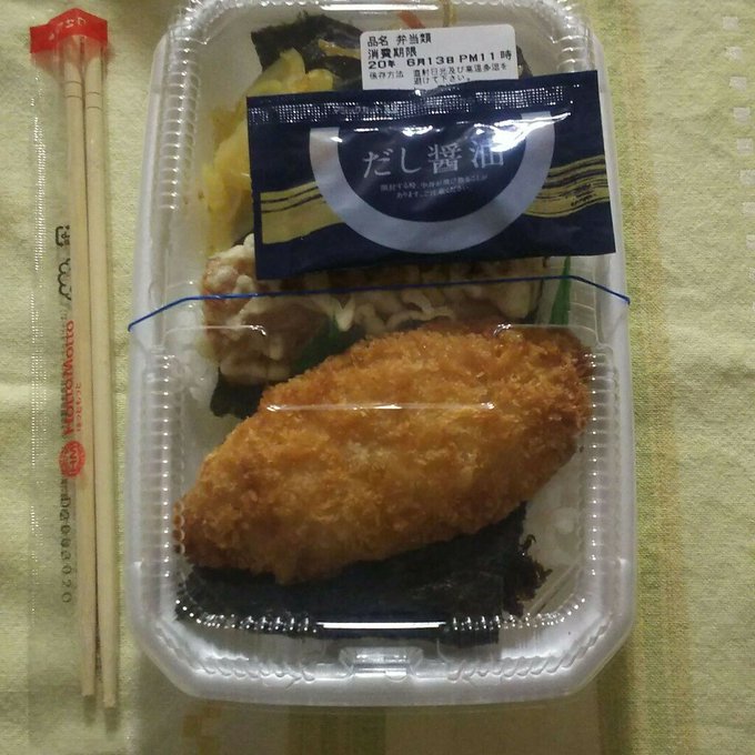 ほっともっと弁当の、のり弁当です。よくわかりませんが、なんでもリニューアルしたんだとか…。一応、以前ついていたソースに変わって、プレミアムソースかだし醤油か選べるようで、オイラは醤油を選びましたが…。