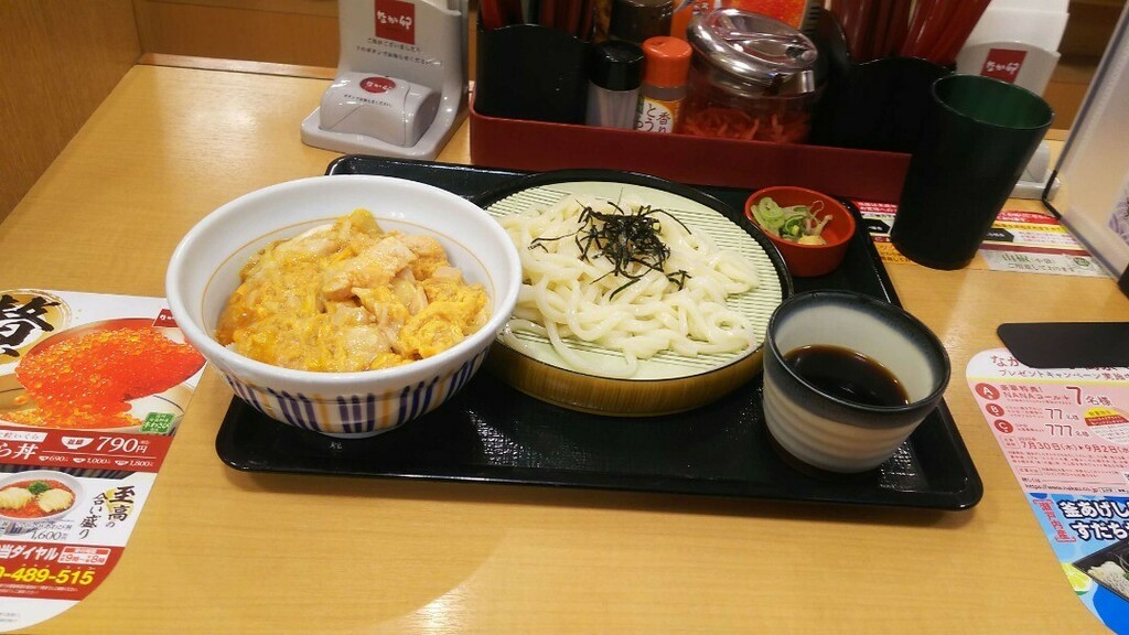 なか卯の親子丼は、三つ葉もネギも入っていないので、彩 ( いろどり ) が寂しいですが、やっぱり親子丼おいしい。ざるうどんもおいしかった、でも、ざるうどんで並サイズは、ちょっと物足りないですね。