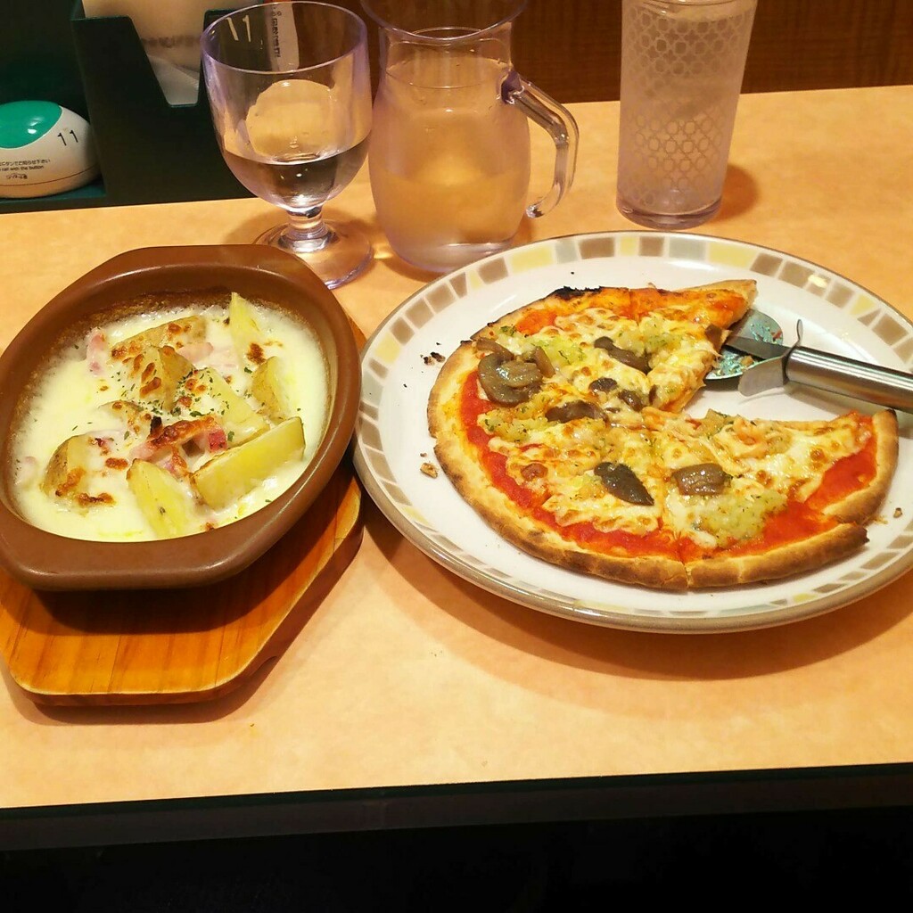 今回は白ワインから注文。食べ物は、季節ものなのか、ポテトのグラタンがあったので、それとピザを頼みました。