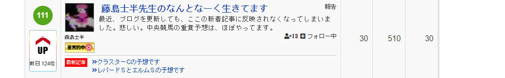 それはさておき、オイラが参加している競馬のブログランキングサイト、順位が本当にどうやってつけれているのじゃ謎ですが、月曜日は 700位ぐらいだったのに、昨日は 111位。