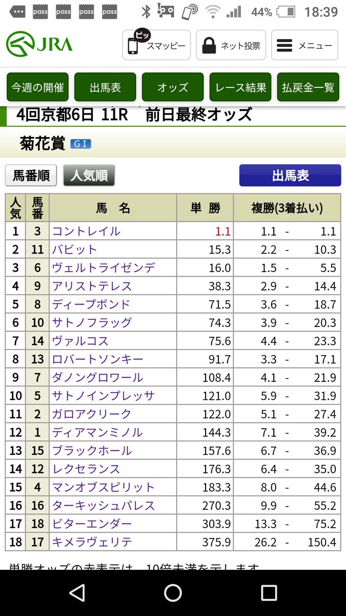 菊花賞の予前日オッズ、前々日オッズを見ると、当然のようにコントレイルが 1番人気ですね。単勝オッズは 1.1倍ですが、これ、もしかしたら JRAプラス10 という制度がなければ 1.0倍ってことではないのかな? まぁ、わかんないけど…。