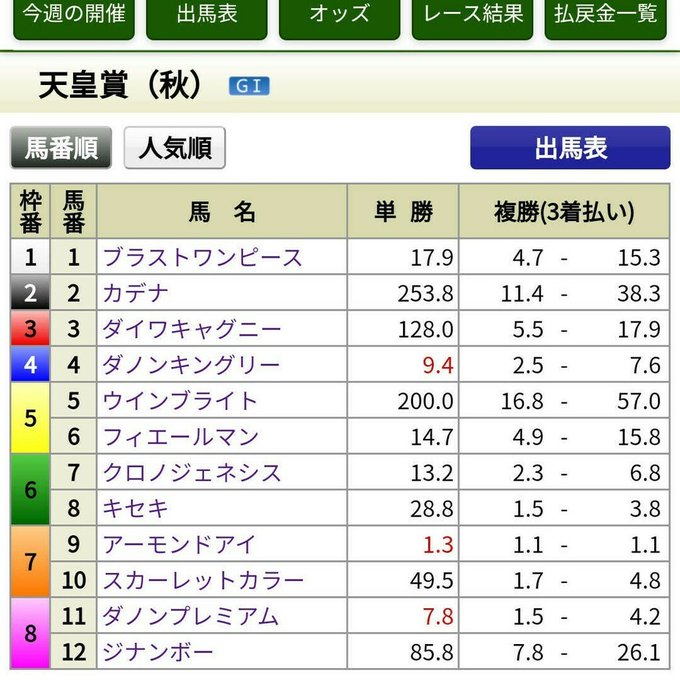 金曜日オッズを見た時は、アーモンドアイはさすがの 1番人気だなぁ…と、思って見ていたものの、2番人気だと思っていたクロノジェネシスが、いまひとつの人気だったので、あれ? って感じでしたが、土曜日の最終オッズを見ると、さすがの 2番人気になっていました。ウオッカとダイワスカーレットと違い同世代ではないものの、牝馬が 1番人気と 2番人気に推される時代がまた来るとは…。