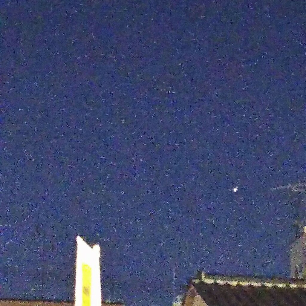 もう一枚、こちらは 18時前に撮ったのですが、空は随分暗くなっていて、自分愛で見た時は、明るい木星と土星もきっちり見えたのですが、どうもスマホのカメラでは、こちらも周囲の明かりを拾ってしまうのか、画面が明るく土星は写っていませんね。一応右端のテレビアンテナの左側の小さい点のような明るいのが木星ですね。