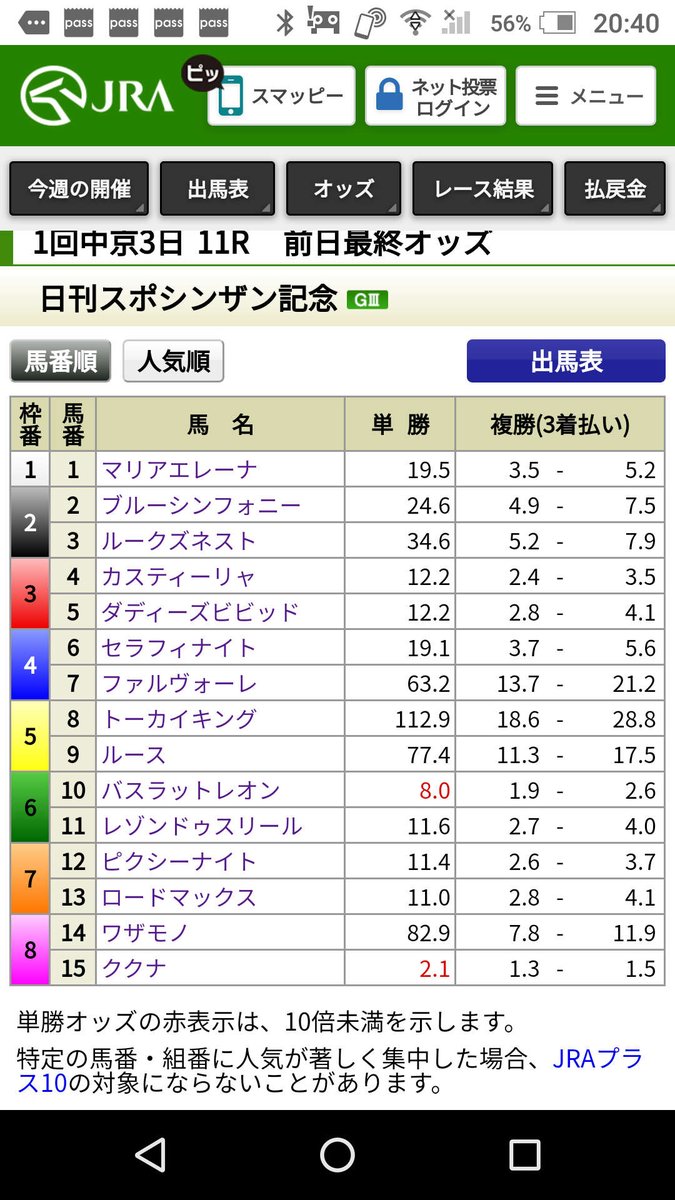 そんなわけで、最初はココナを本命にしようと思っていたのですが、ちょっと穴も狙ってみたくなって、岩田 ( 息子 ) 騎手の乗るロードマックスを本命にしたのですが、5~ 6番人気かと思っていたら、前日最終オッズでは単勝 3番人気ですか…。