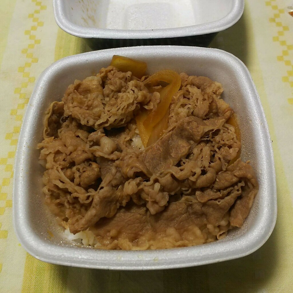 今日、仕事帰りに吉野家に寄ったら、「牛丼 ( 並 ) 2個で 700円」とあったので、「おっ、安いやん。」と思って買ったら、税抜きで 2個 700円でした。税込みだと 756円したので、通常より 4円安いだけでした。まぁ安くなっているといえばなっているのですが…。